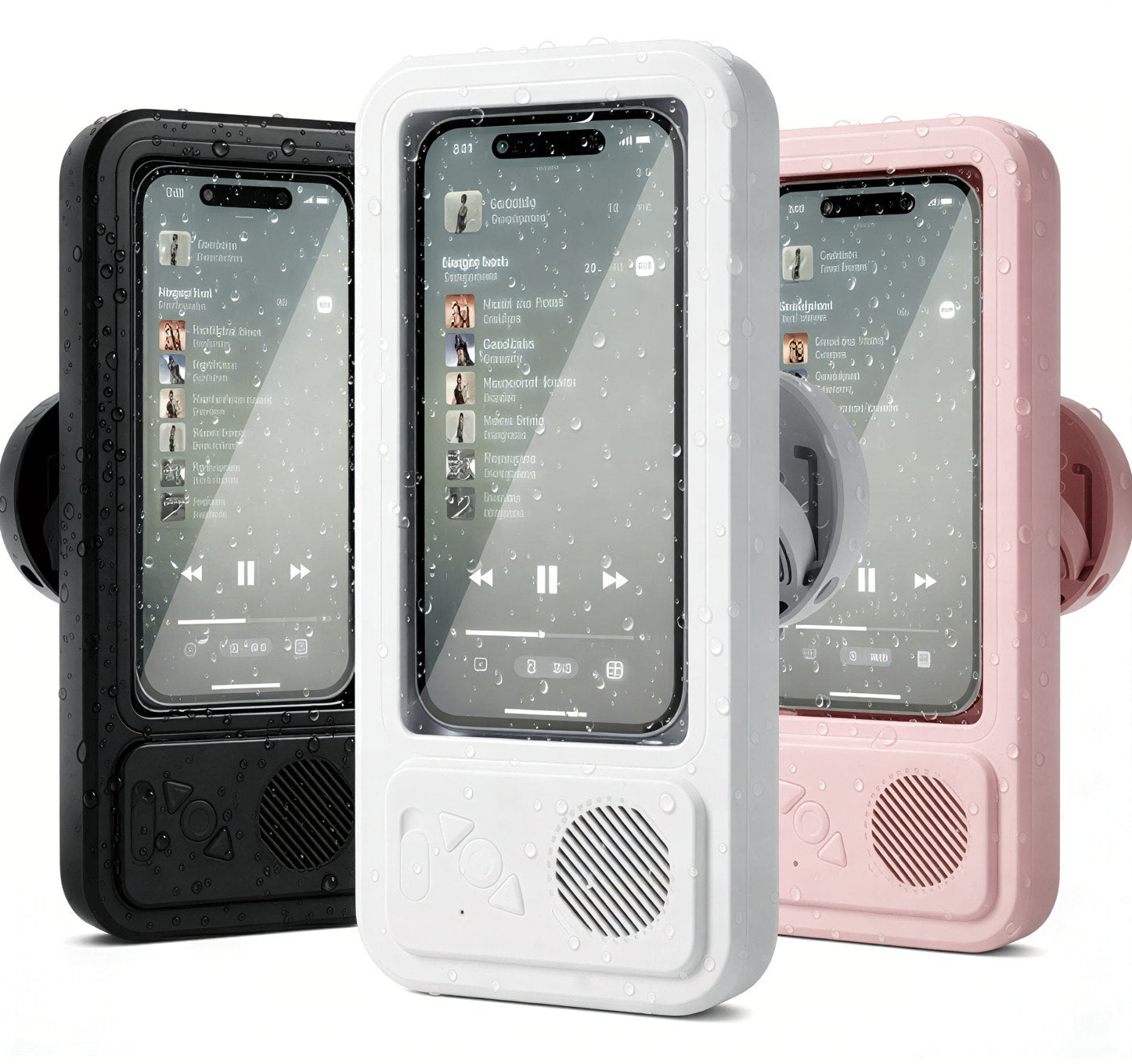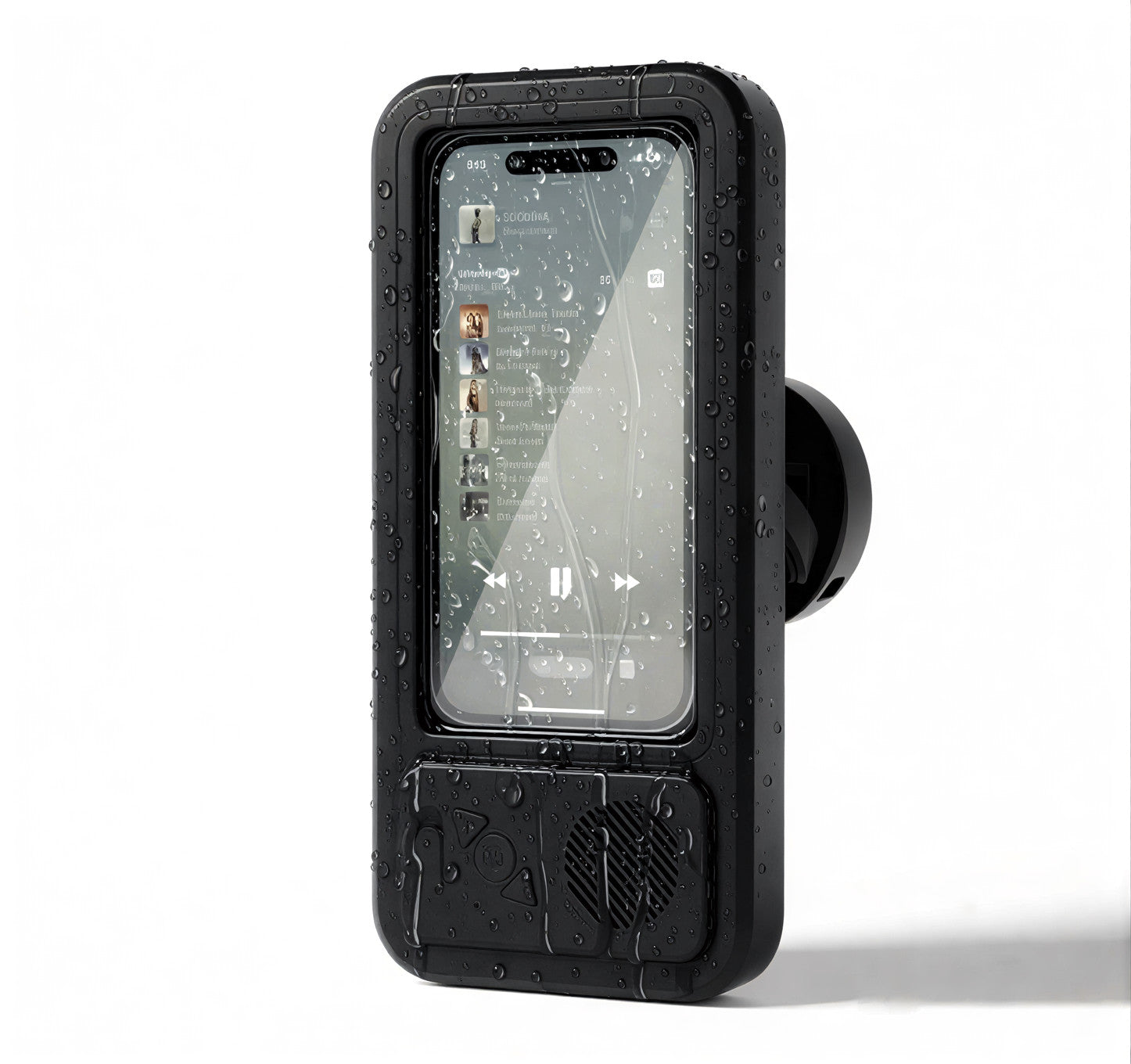 Only holder combining waterproof case, amplified speaker, and 360° rotation in one sleek design